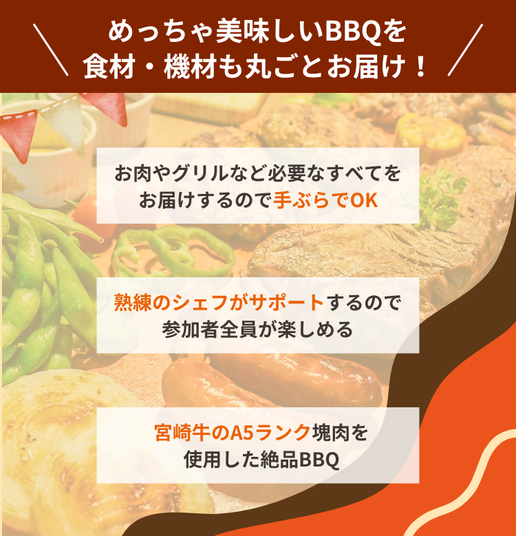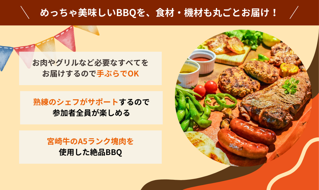 宮崎牛A5ランク塊肉を使用したこだわりの本格BBQを丸ごとお届けいたします。手ぶらでバーベキューやBBQケータリングをお考えでしたら、ぜひ本格出張BBQにお任せください。