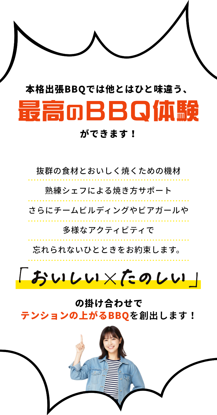 本格BBQを手軽に楽しみたい方にオススメ!バラエティ豊かなメニューで最後まで飽きずに味わえます。